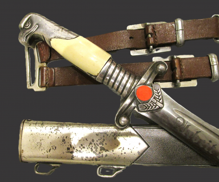 Original M38 RAD Hauer für Führer Hersteller WKC Solingen mit dazu gehörigem Ledergehänge von Assmann. Die weißen Griffschalen haben mit Gebrauchsspuren, ansonten ein guter Zustand.