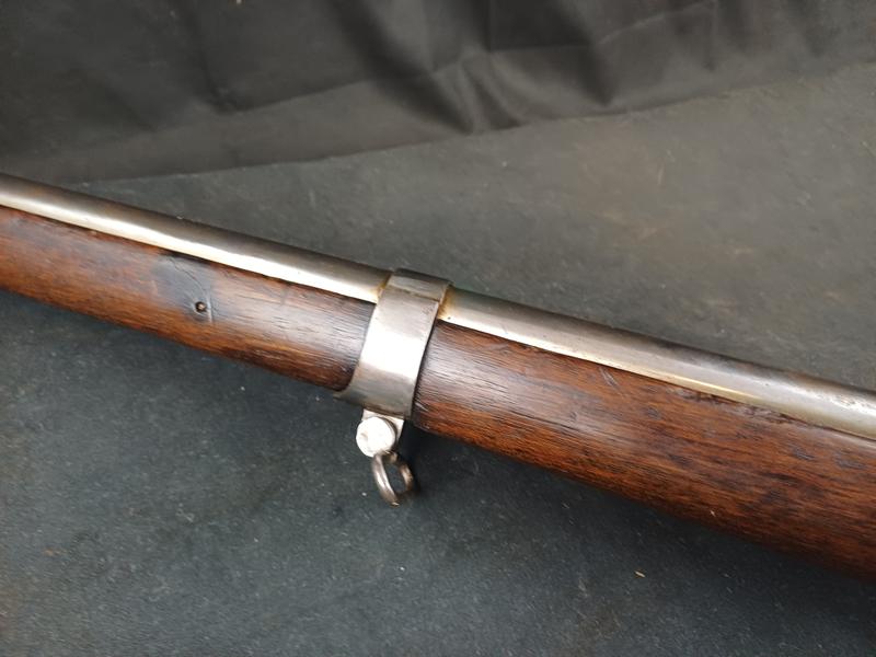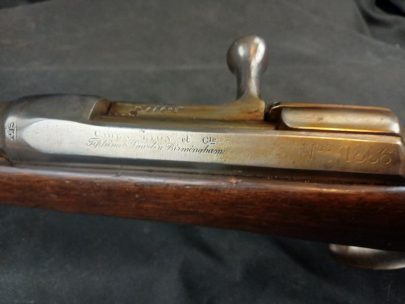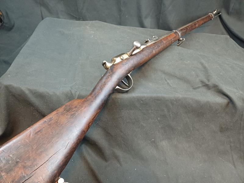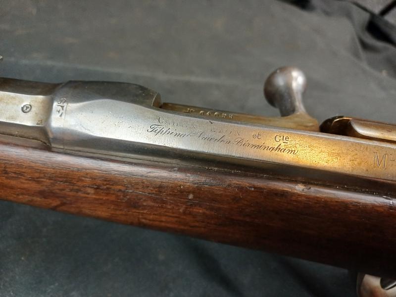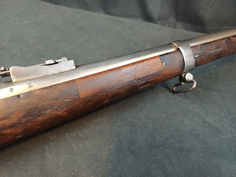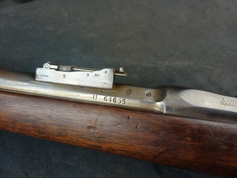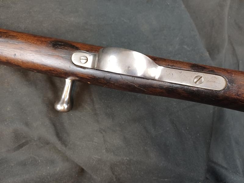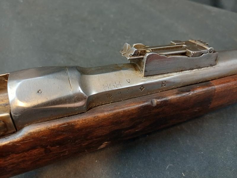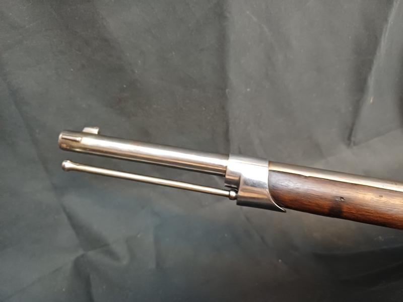 Dieses Chassepot wurde mal überarbeitet, ist technisch einwandfrei und sollte seinen Dienst zielgenau verrichten. Noch gut sichtbare Stempel und Punzen. Das Schloss läuft tadellos. Ein sicherlich nicht alle Tage anzutreffender Chassepothersteller!