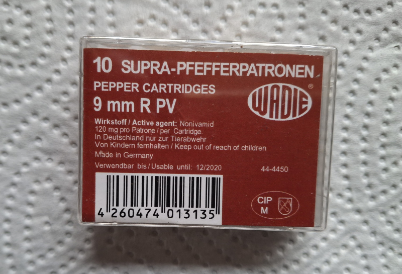 Verkaufe 1 Packung Pfefferpatronen (10 Stück) im Kaliber 9mm R (.380) PV der Firma Wadie. Im Vergleich zu aktueller Munition sind sie noch schön stark geladen, 120 mg Novadimid pro Patrone. WICHTIG: die „Haltbarkeit“ der Munition ist bereits überschritten, sie funktioniert jedoch noch einwandfrei. Munition wurde fachgerecht gelagert. Die Munition ist natürlich neu, s. Bild, Bild und myGun sind Bestandteil des Verkaufsangebotes.