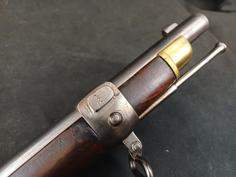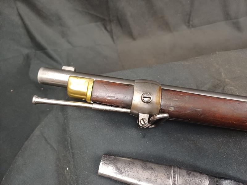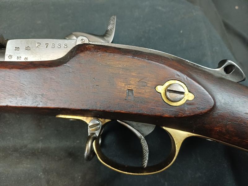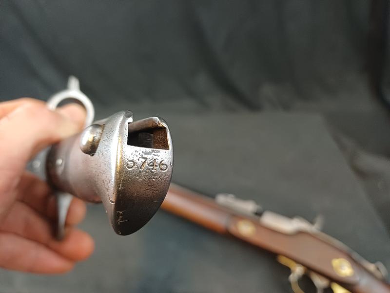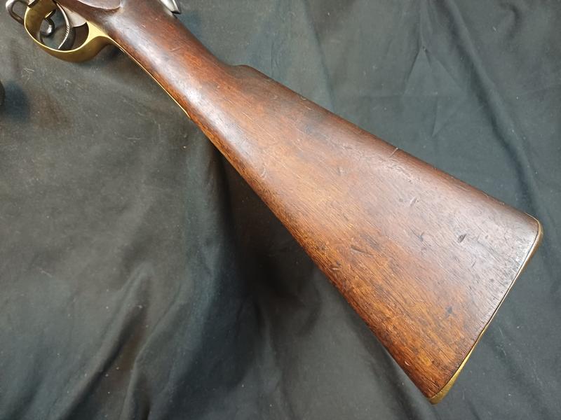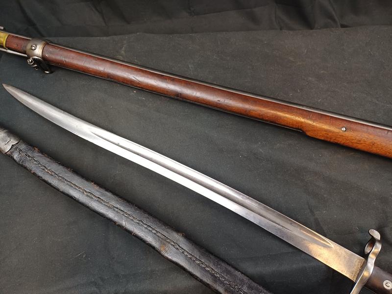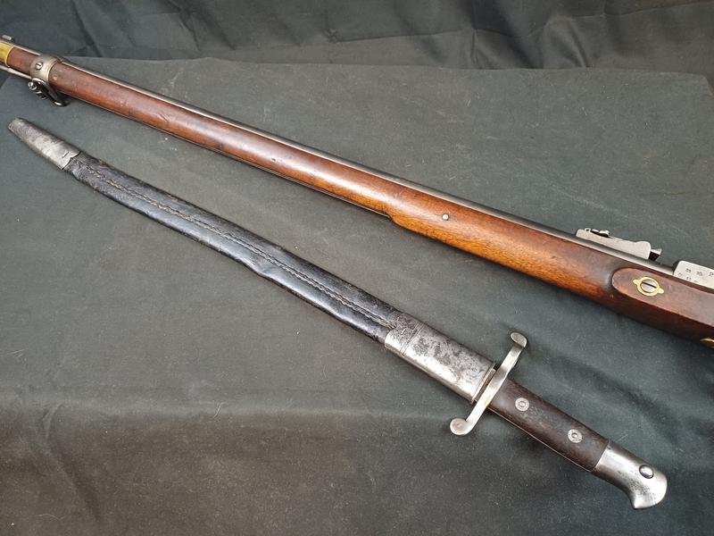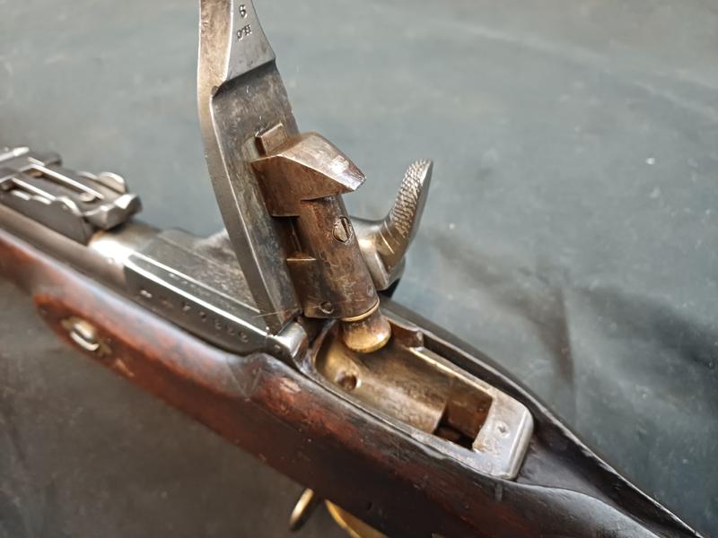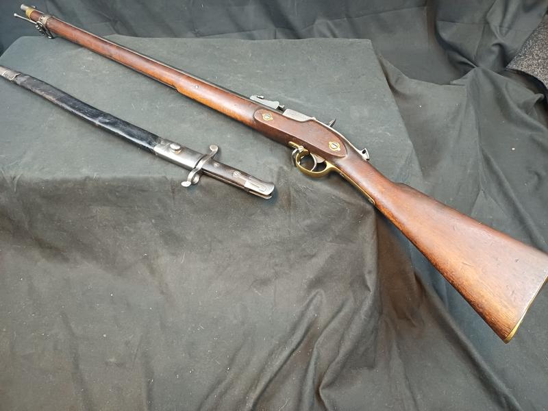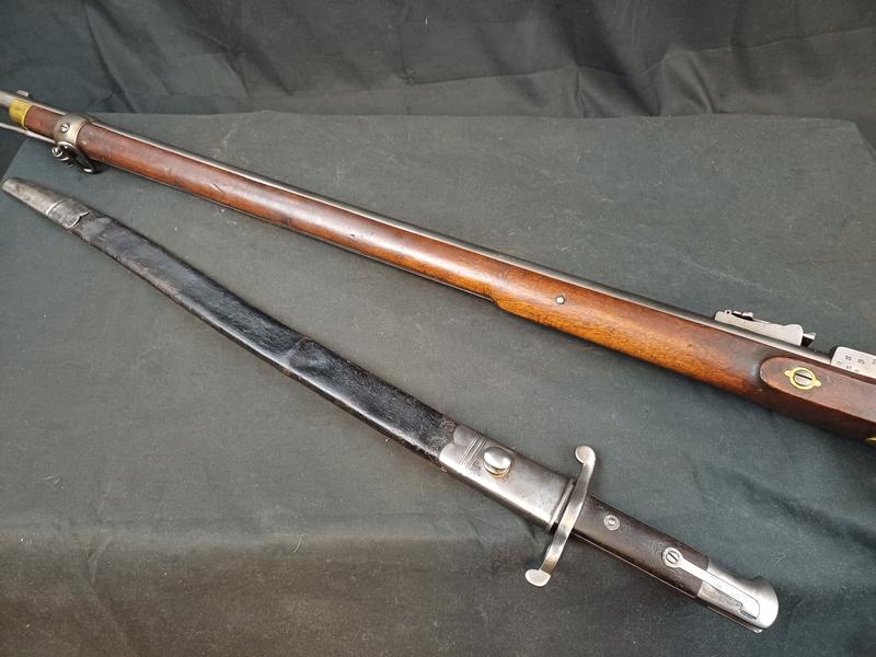Das Schloss läuft tadellos. Das Piston ist frei und gängig. Das Gewehr stammt aus dem Portugalkontrakt von Westley Richards. Das seltene Bajonett lässt sich vollständig aufpflanzen, ist aber nicht nummerngleich. Das Gewehr hat eine schöne Patina.