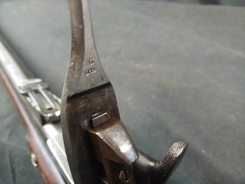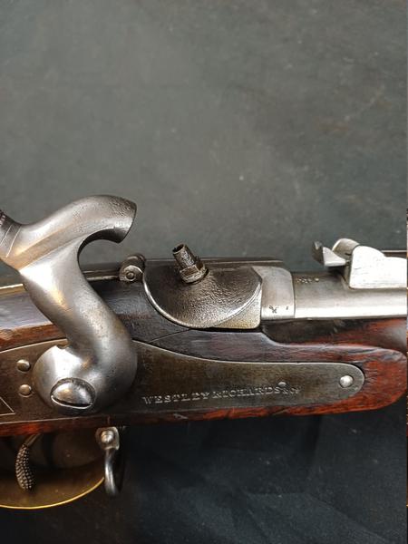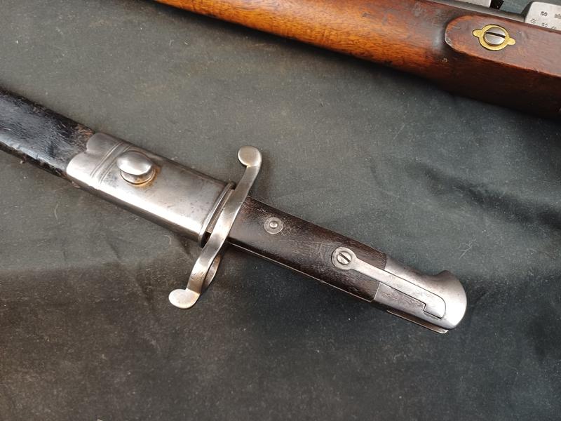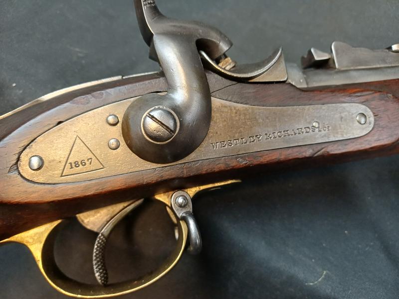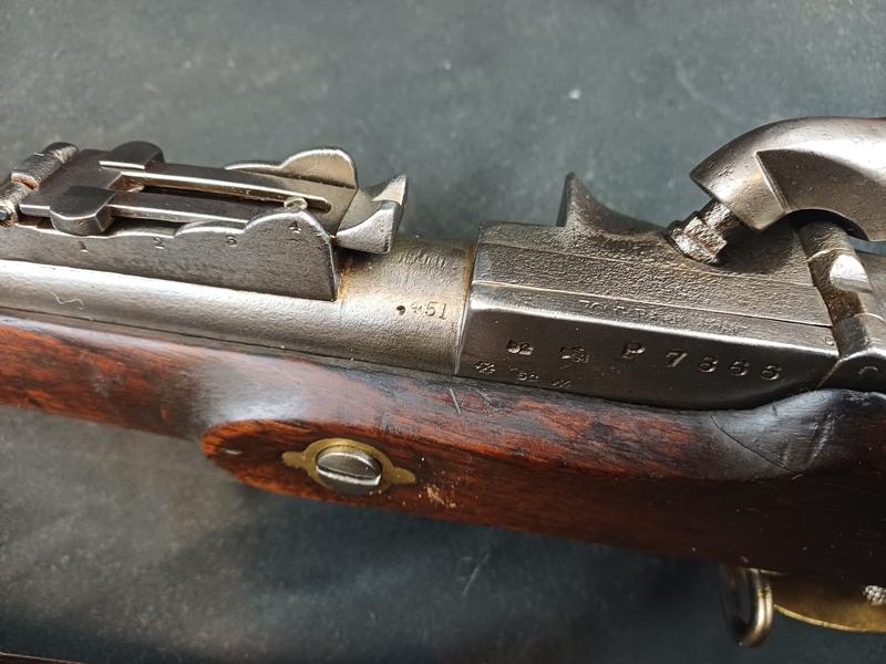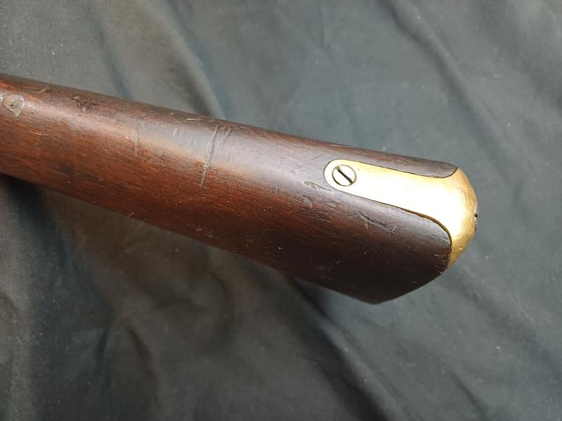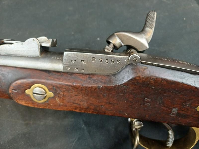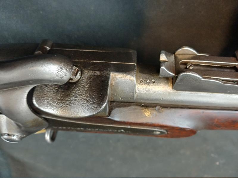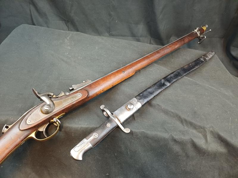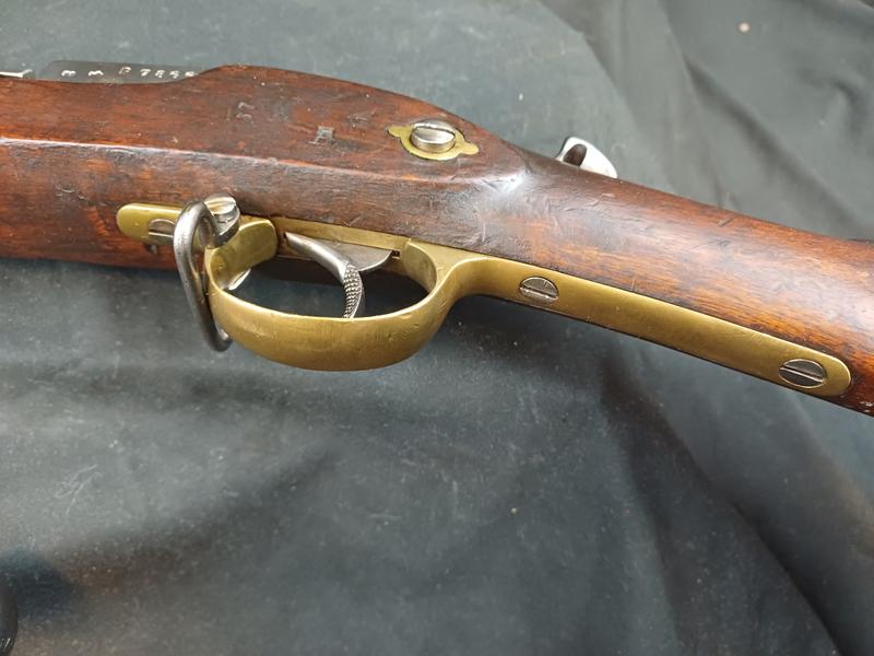 Das Schloss läuft tadellos. Das Piston ist frei und gängig. Das Gewehr stammt aus dem Portugalkontrakt von Westley Richards. Das seltene Bajonett lässt sich vollständig aufpflanzen, ist aber nicht nummerngleich. Das Gewehr hat eine schöne Patina.