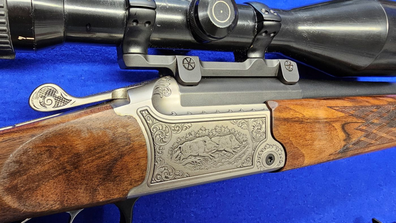 mit Einstecklauf .22Hornet und montiertem Zielfernrohr der Marke Schmidt & Bender 2.5-10x56.