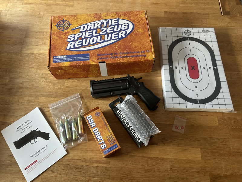 Es handelt sich bei dieser Auktion um das Deluxe Set, welches zu der Pistole, eine weitere Trommel, 50 Darts, 4 CO2 Kapseln (Die bereits benutzte entferne ich… waren 5) und eine Zielscheibe beinhaltet.