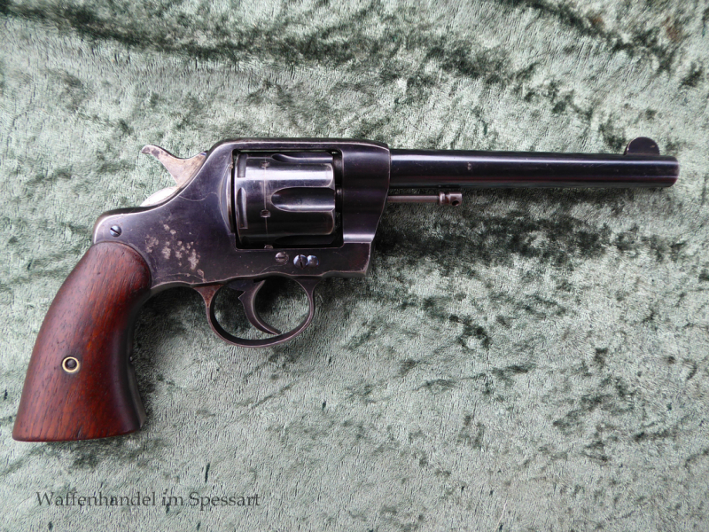Kal. .38Long Colt. Ser.Nr. 150882. Baujahr 1901. Scharfkantiges blankes Laufinnere. Firmierung auf dem Lauf mit Patente 1884 bis 1895. Sehr gut erhaltene bläuliche Brünierung. Sehr gutes feines Timing. Geringer Tommelspalt. Mit "stehender" Trommel.