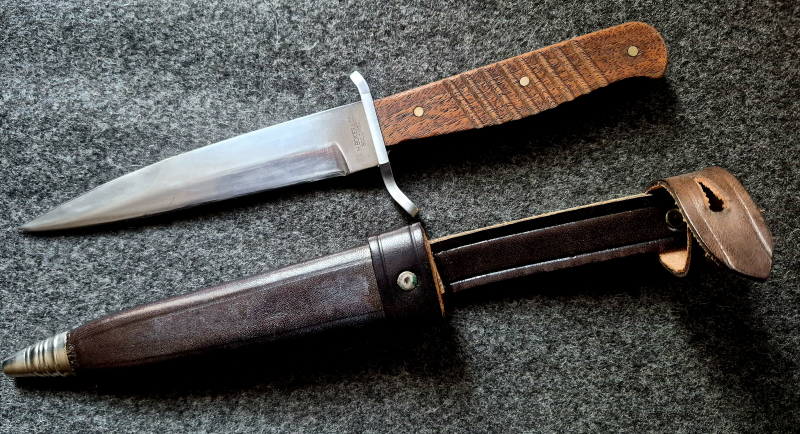 Zum Verkauf steht ein Böker Grabendolch (Trench Knife) – hergestellt von Heinr. Böker Baumwerk GmbH in Solingen (Deutschland). Dieser Dolch ist eine originalgetreue Neuauflage eines klassischen Kampfmessers, das 1915 im Auftrag des deutschen Kriegsministeriums zur Verwendung im Grabenkrieg entwickelt wurde.