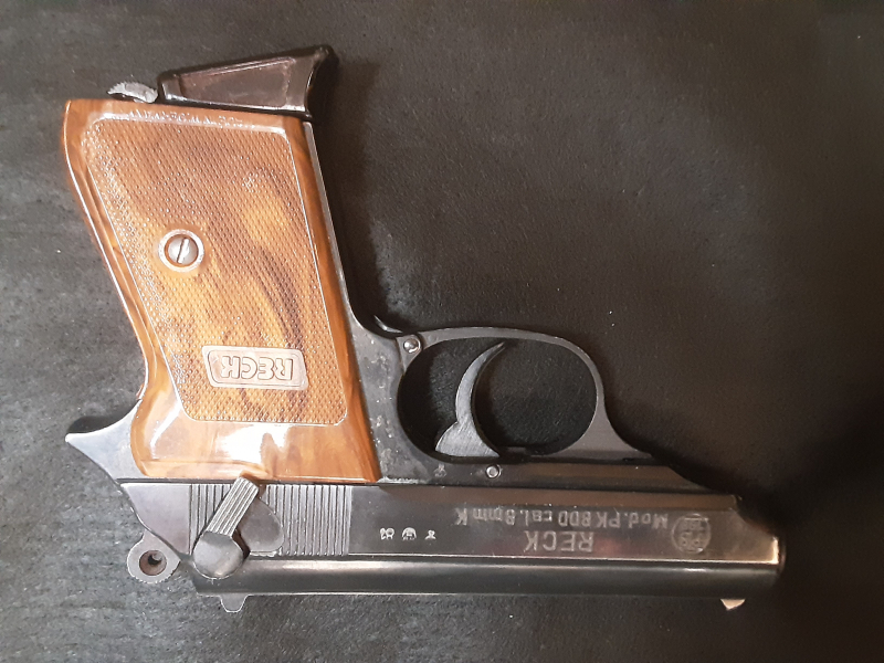 Die Version mit der Schreckschraube, ohne seitliche Patronenlager Schwächung. Ich habe damit nicht geschossen. Trockenfunktion ist gegeben. Für das Alter noch recht schön.