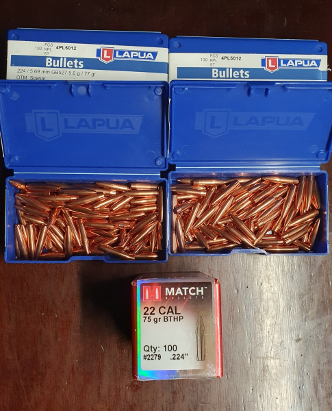 Verkaufe 370 Stk Lapua Scenar Kal. 224" 77 grs HPBT + 89Stk Hornady Match .224" 75grs HPBT für 223Rem, im AR15 u.ä. ..... . Verkauf weil nicht mehr benötigt. Egun ich Versand der Käufer. Keine Garantie,Umtausch oder Rücknahme. EU Versand ca. 15-20€.
