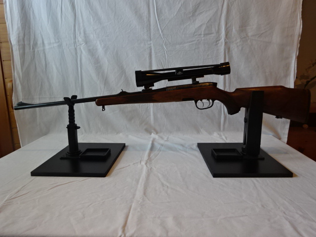 Repetierbüchse von Steyr Mannlicher im Kaliber 5,6x50 R mag. Mit ZF Hertel Reuse 2 1/4 x 50 Macro variabel und offener Visierung. Die Waffe besitzt einen deutschen Stecher und eine deutsche Backe am Schaft.