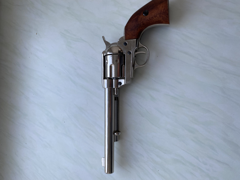 Diesen Zinkdruckguss Revolver kann man spannen und abschlagen sowie die Ladeklappe öffnen.Hersteller habe ich nicht gefunden.