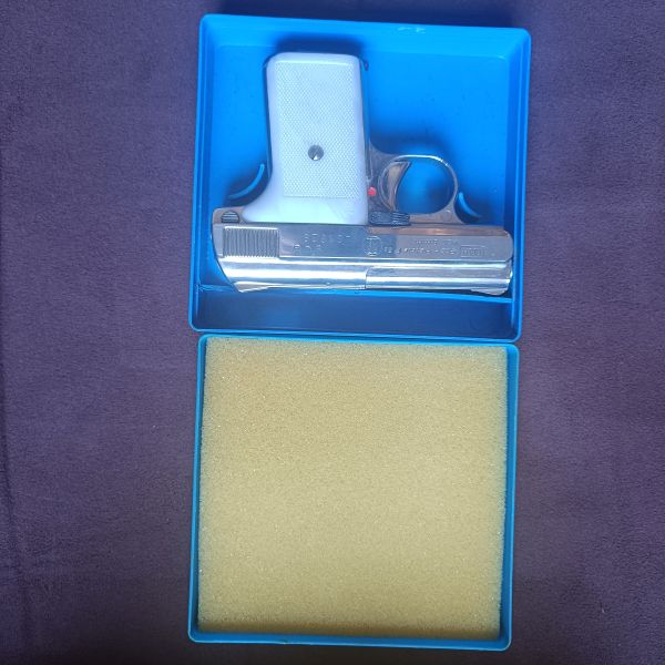 Hallo, verkaufe hier aus dem Nachlass meines Opa eine Reck P 6 Schreckschuss Pistole In Chrom. Also etwas besonderes für Sammler, da es die so nicht mehr all zu oft zu finden ist. Klar sie wurde geschossen und hat leichte Gebrauchspuren aber nichts Schlimmes wie man den Bildern entnehmen kann. Sie funktioniert und kommt in der blauen Original Verpackung. PTB ist von 78 sie ist klein aber schwer, die Putzbürste war auch noch vorhanden aber finde sie leider nicht mehr wieder :-( Griffschalen sind aus Plastik in Perlmutt Optik.