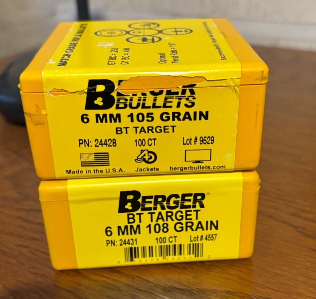 Verkaufe wegen Aufgabe des Sports meine Geschosse Berger 6mm Norma BR BT Target wie in Abbildung ersichtlich. Es handelt sich um jeweils 100 Stück mit 105 und 108 grains. Zu der Qualität der Berger-Geschosse gibt es nicht viel zu sagen. Ich schieße diese Geschosse seit vielen Jahren auf allen Meisterschaften des DSB und habe trotz meines fortgeschrittenen Alters bei der DEutschen Meisterschaft in München im Jahre 2025 noch 590 Ringe in der Disziplin GK 300m Liegend erreicht. Dies ist wie immer eine Privatauktion, daher keine Rückgabe und kein Umtausch. Dazu werden sie auch keinen Grund haben, denke ich.