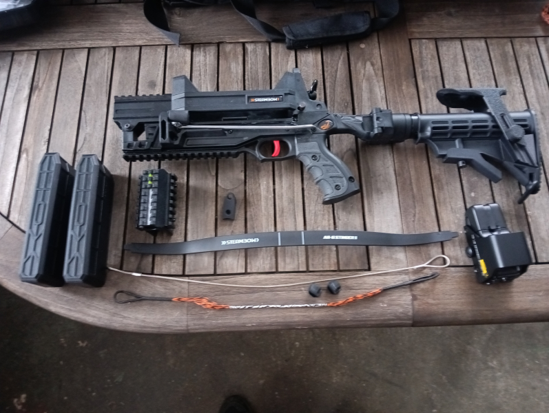 Servus, Verkaufe meine Steambow M10 Offener Körper, Wangenauflage(3D Druck), Klappschaft, Sehnen Dämpfer, Griffstück, Holo Visier, zweites Magazin, Tuning Trigger, Standart wurfarm, Sehne, Spannsehne Keine Bolzen