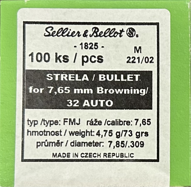 Abverkauf, 100 Stück Sellier&Bellot Geschosse, .32Auto (7,65Luger) FMJ 73gr
