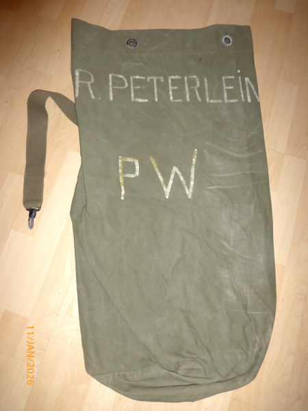 Sie bieten auf einen original US-Seesack aus dem 2. Weltkrieg, beschriftet mit PW R. Peterlein. Für den Prisener of War waren die Abkürzungen PW oder POW üblich. Unveränderter Fundzustand, für das Alter schön erhalten. 3 minimale Löchlein, neutraler Geruch, innen und außen sauber. Abmessungen ca. 95x52cm - Dieses ist eine Privatauktion, keine Garantie oder Rücknahme.