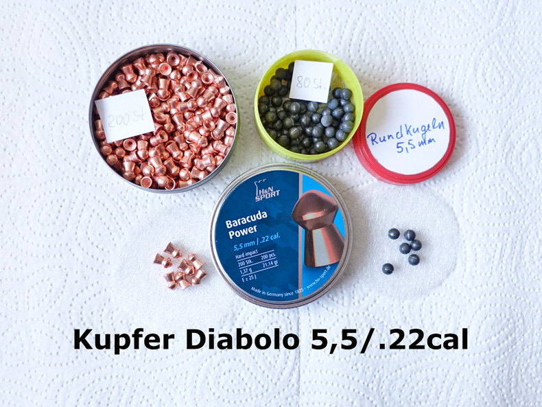 Die Dose mit den 5,5mm Bleikugeln 80 Stück gibt es gratis dazu, die haben leichte Spuren auf der Oberfläche sind von delaborierten 6mm Flober Kugeln.