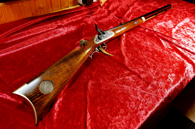 Silberdollar eingearbeitet. -Wert des Dollars ca. 90 €- Der gezogene blanke Lauf hat eine Länge von ca. 81,5 cm.