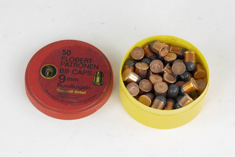 Verkauft werden 50 Schuss 9mm Flobert Rundkugeln von Dynamit Nobel.