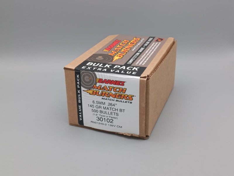 Die Barnes Match Burner Geschosse im Kaliber 6,5mm mit 145grain wurden speziell für präzisionsorientierte Wiederlader und Sportschützen entwickelt. Sie bieten eine ausgezeichnete Kombination aus hoher Eigenpräzision, konstanter Fertigungsqualität und einem attraktiven Preis-Leistungs-Verhältnis.