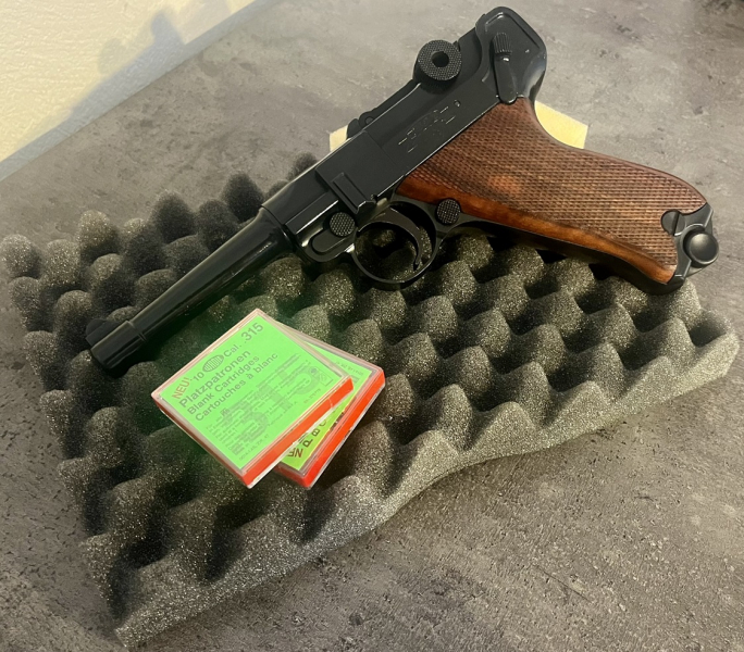 Die legendäre Kniegelenkpistole befindet sich in sehr gutem Sammlerzustand und kommt mit 20 Stück Wadie Platzpatronen (.315 Knall).