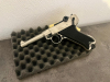 Zum Verkauf steht das nächste historische Highlight aus meiner Militär-/Polizei Reihe: die ME P08 im Kaliber 9 mm Knall, in schönen vernickelten Ausführung mit dunklen Holzgriffschalen. Ein optisch wie technisch äußerst attraktives Sammlerstück, das dem legendären Original besonders nahekommt.