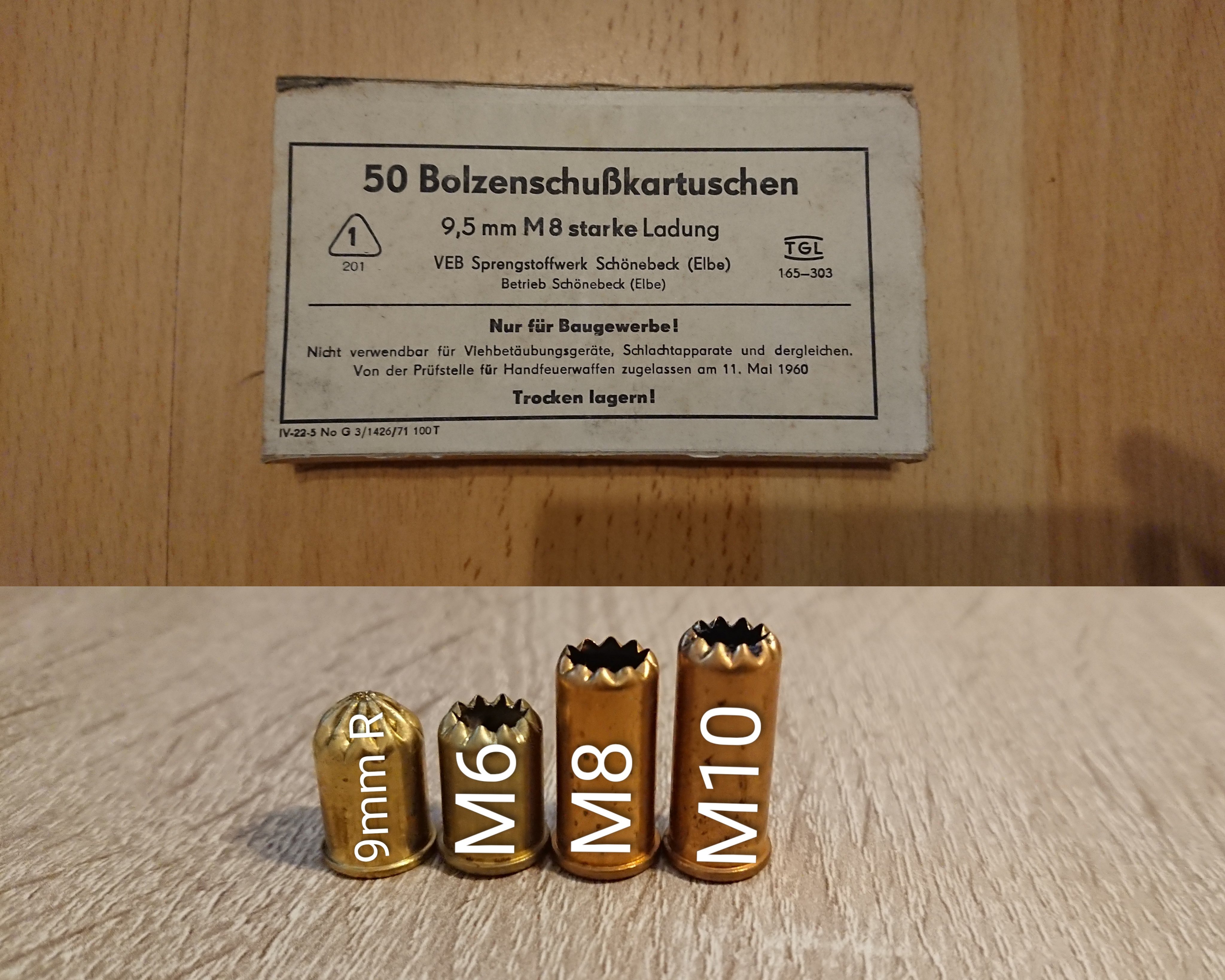 Sie bieten hier auf 50 Stück M8 (starke Ladung) Bolzenschusskartuschen vom VEB Sprengstoffwerk Schönebeck. Sie wurden verwendet für den DDR Dübelsetzer/Bolzenschussgerät aus Suhl. Die Kartuschen passen bei manch einem alten Schreckschussrevolver (RG89) was NICHT zu empfehlen ist, da die Ladung zu stark für den Zinkdruckguss ist und die SSW explodieren kann... War jahrelang trocken gelagert und funktioniert!