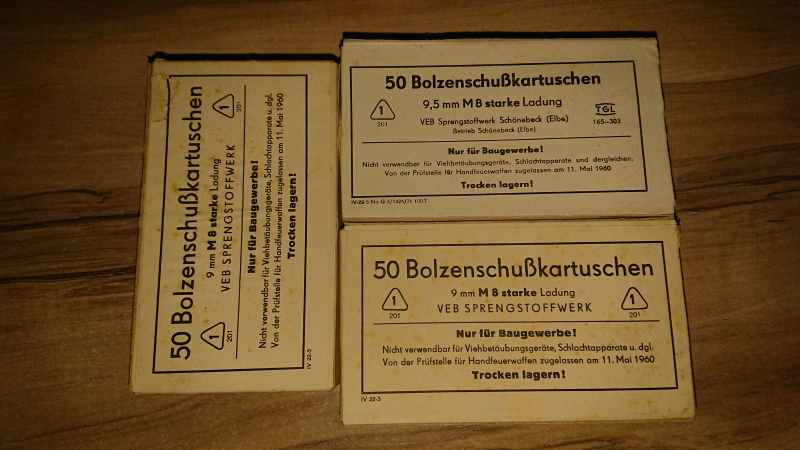 Sie bieten hier auf 150 Stück M8 (starke Ladung) Bolzenschusskartuschen vom VEB Sprengstoffwerk Schönebeck. Sie wurden verwendet für den DDR Dübelsetzer/Bolzenschussgerät aus Suhl. Die Kartuschen passen bei manch einem alten Schreckschussrevolver (RG89) was NICHT zu empfehlen ist, da die Ladung zu stark für den Zinkdruckguss ist und die SSW explodieren kann... War jahrelang trocken gelagert und funktioniert! Die Verpackung ist teilweise beschädigt.