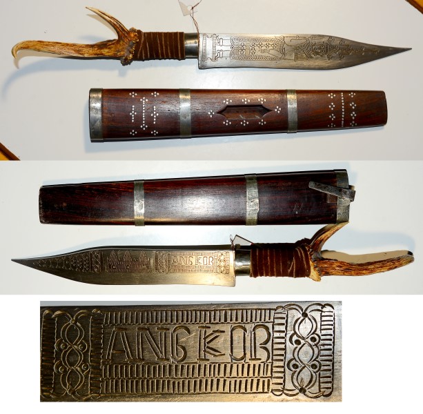 Messer aus Kambodcha, Zierstück mit 22,7 cm langer schweren Klinge, Holzscheide