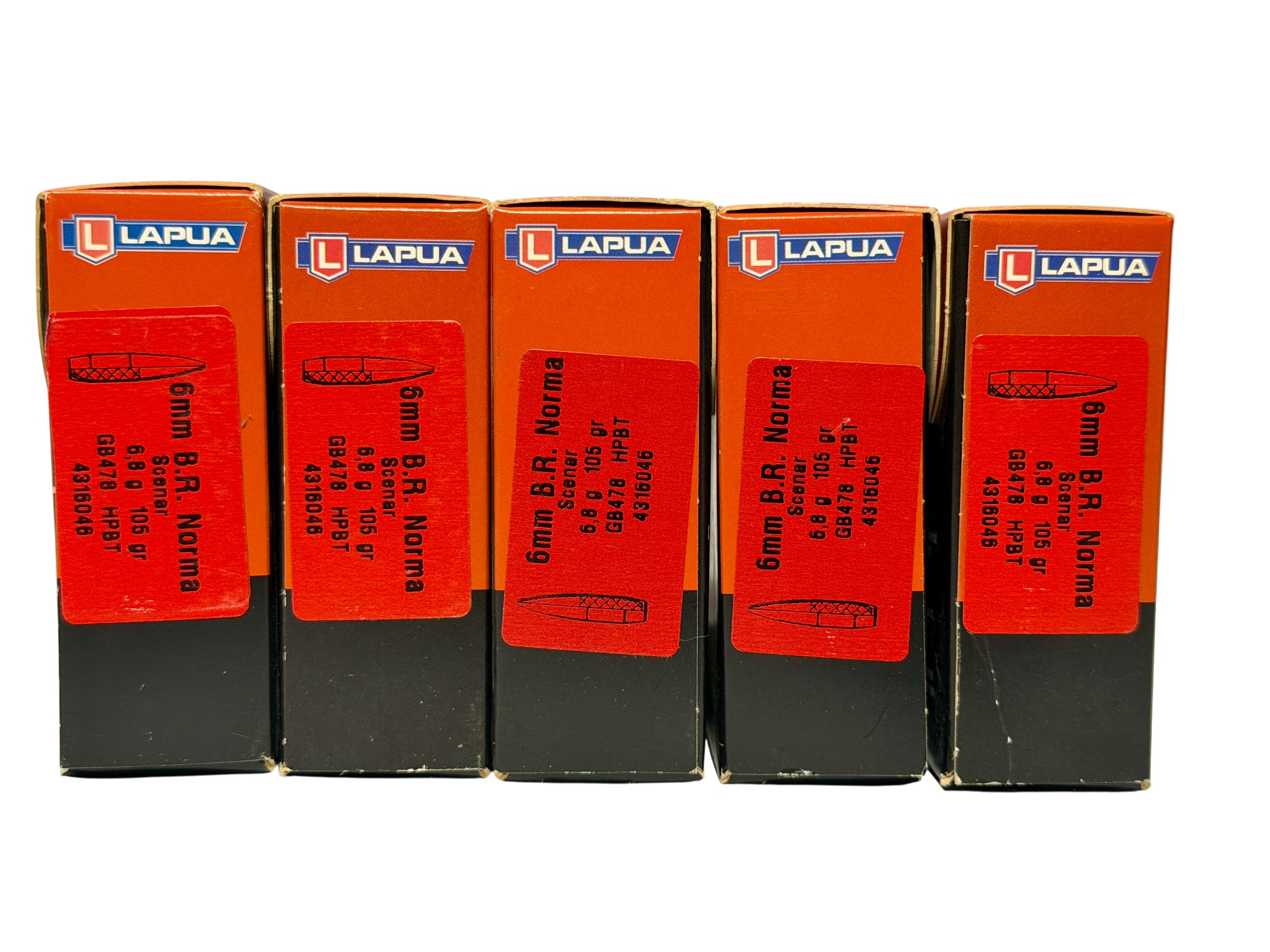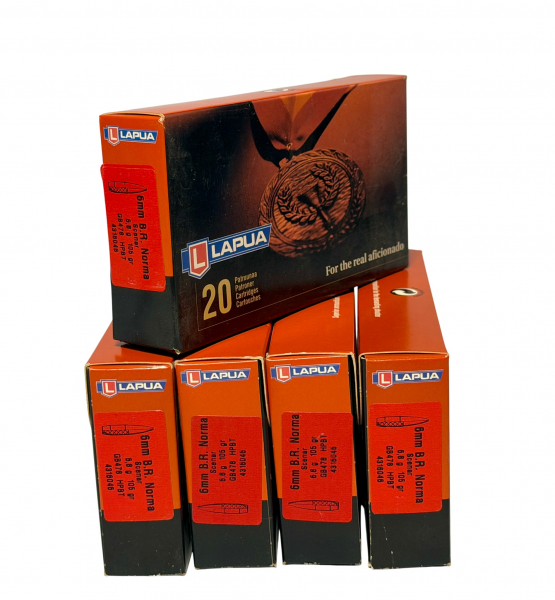 Biete hier für einen Jagdfreund 5 Packen á 20 Schuss (ingesamt 100 Schuss) Munition der Firma Lapua, im Kaliber 6mm B.R., mit Scenar 6,8gramm 105gr. HPBT Geschoss an. Die Munition ist ungeöffnet und wurde kühl und Trocken gelagert.