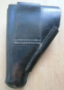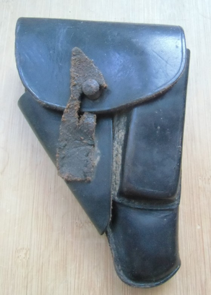 Holster für eine Taschenpistole aus der Zeit des Zweiten Weltkrieges, laut Hersteller für eine Walther PPK ...Glattes Leder, mit Stahlgarnitur. Leder geschwärzt?? Jedenfalls unter dem Verschlussriemen und der Gürtelschlaufe braunes Leder sichtbar.