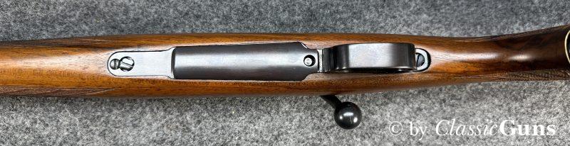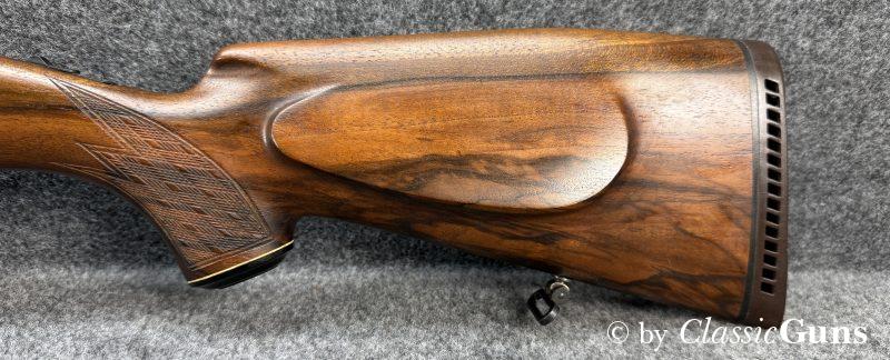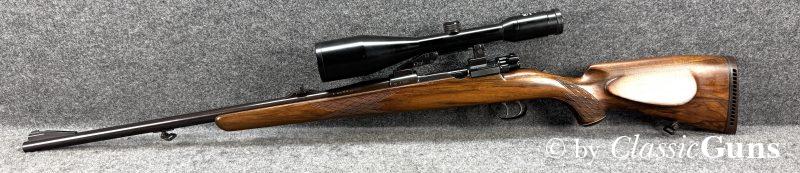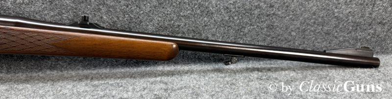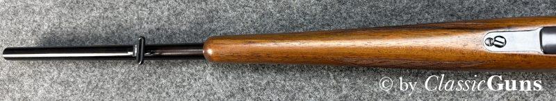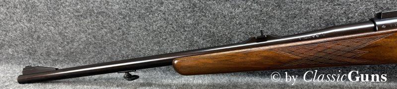 Die führige Waffe verfügt über einen 570 mm langen Lauf mit neuwertigem Zug-/Feldprofil. Deutscher Stecher, klassische Dreistellungssicherung und zusätzliche Schiebesicherung, Mittelschaftmagazin für fünf Patronen, tief schwarze Hochglanzbrünierung der Stahlteile. Ansprechend gemaserter und erstklassig erhaltener Schaft aus geöltem Nussbaum.