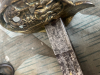 Die Klinge hat mehrere Flecken und die Schneide wirkt so als hätte mal jemand damit gespielt (siehe Fotos). Auf der Klinge ist eine Herstellermarkierung und die Inschrift: Meinem lieben Leo zur Erg an den 27. Febr 1915 gewidm seine treue Paula.