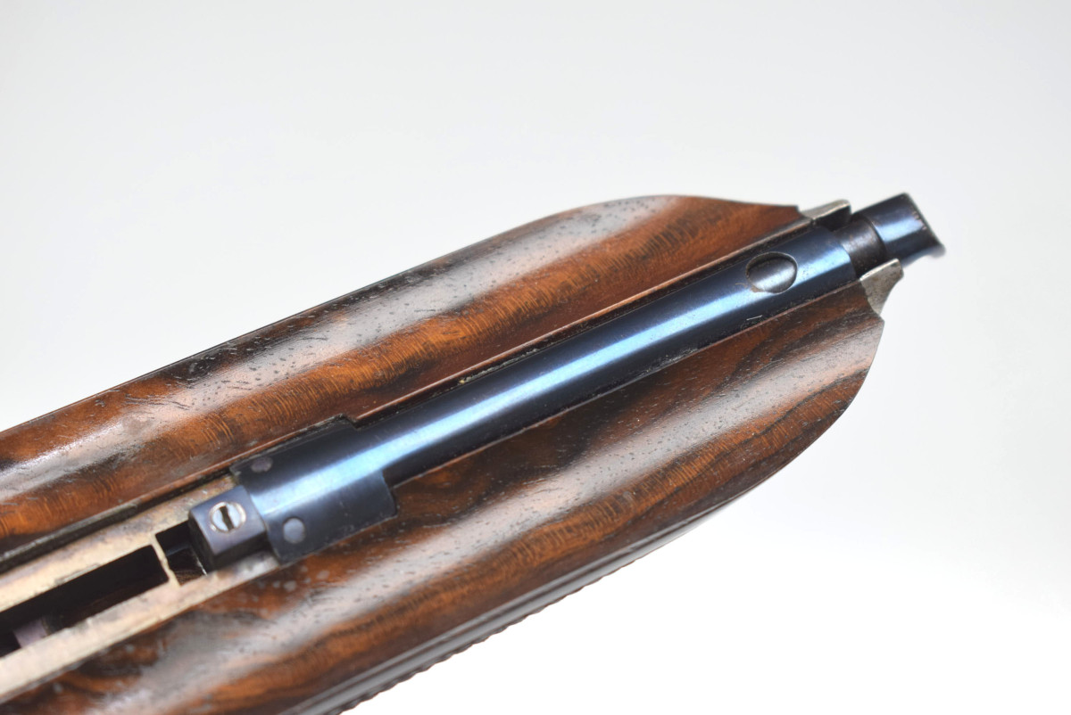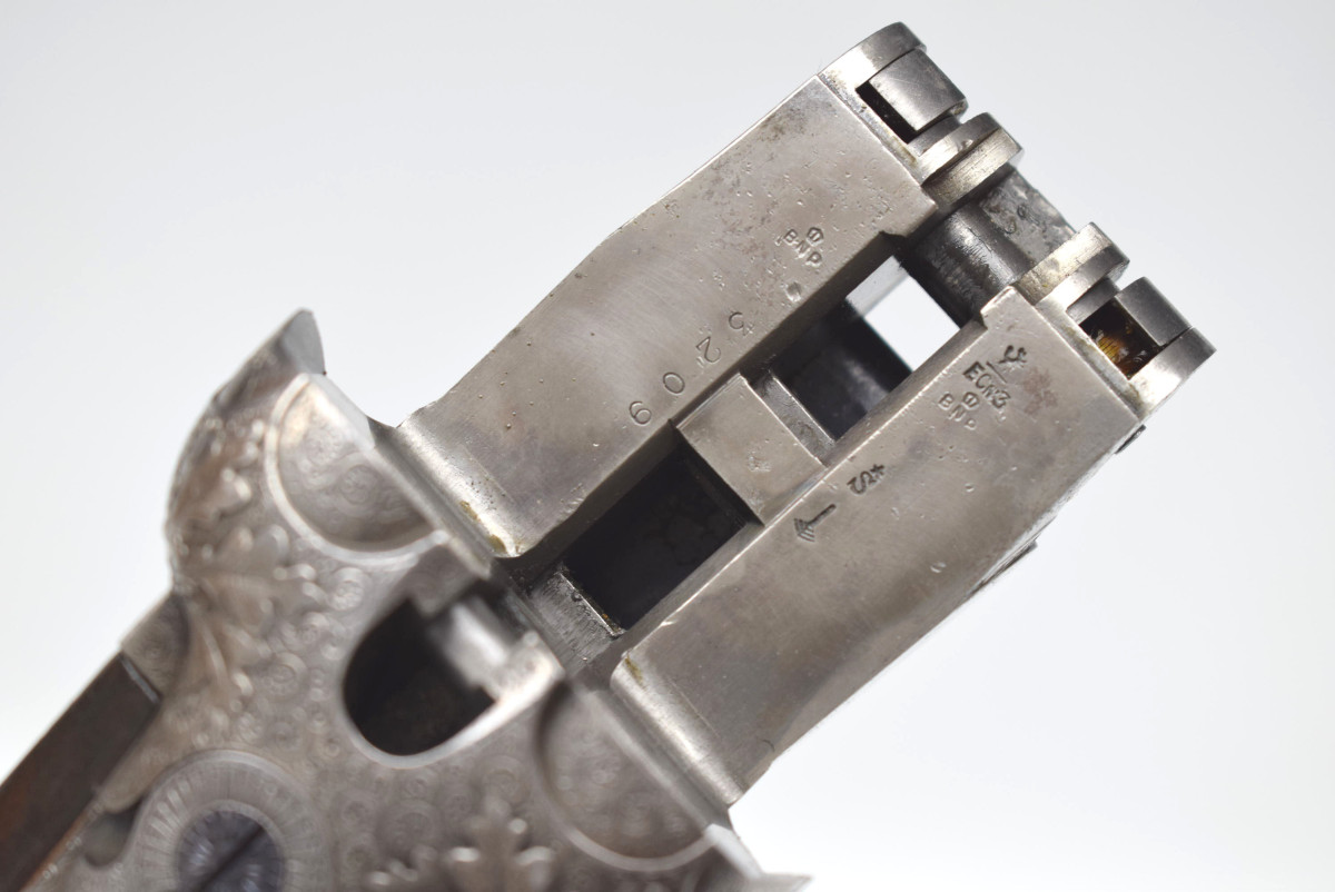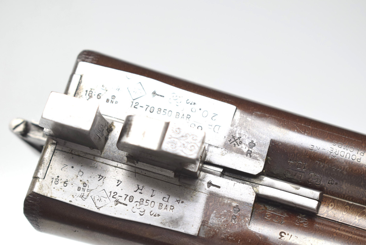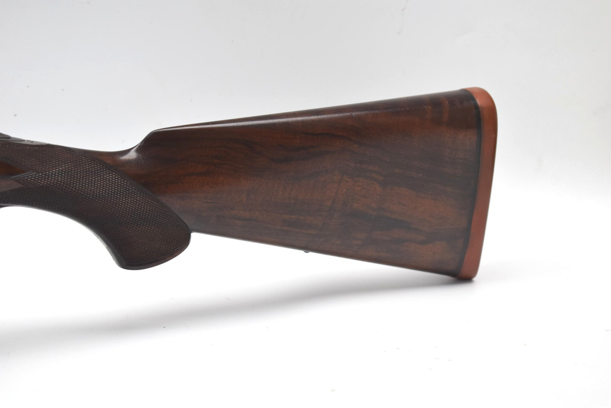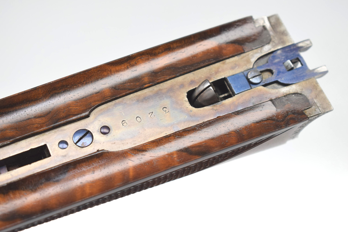 Läufe sehr gut, Verschluss dicht, Brünierung 97%, kleine Beschädigung am Schaft linksseitig ohne Einfluss auf Funktion oder Sicherheit