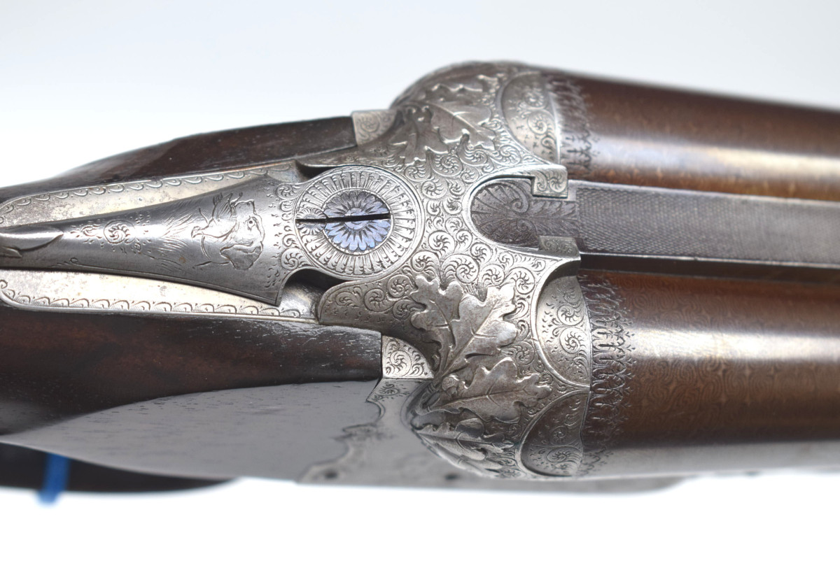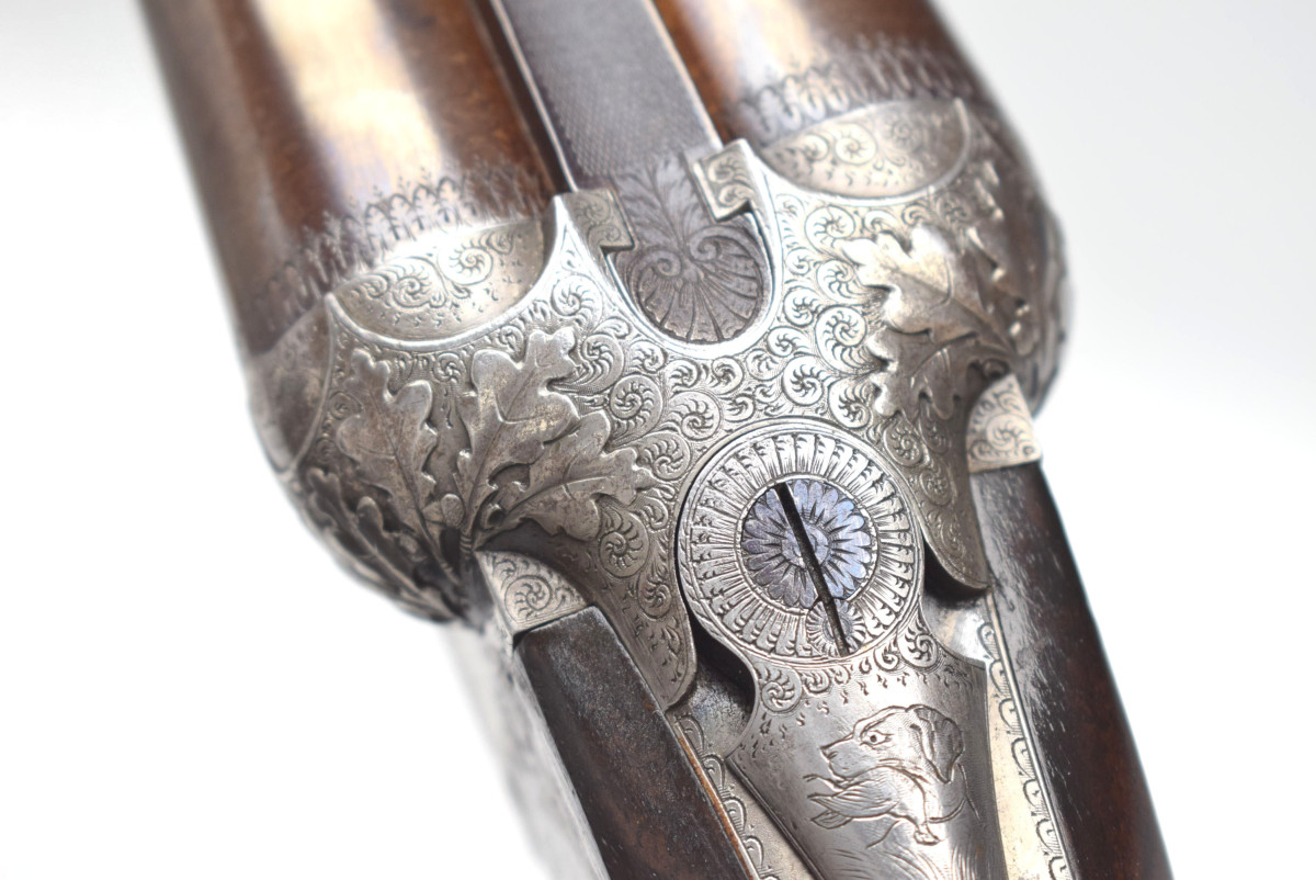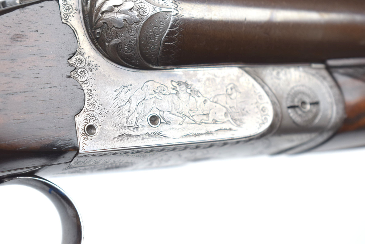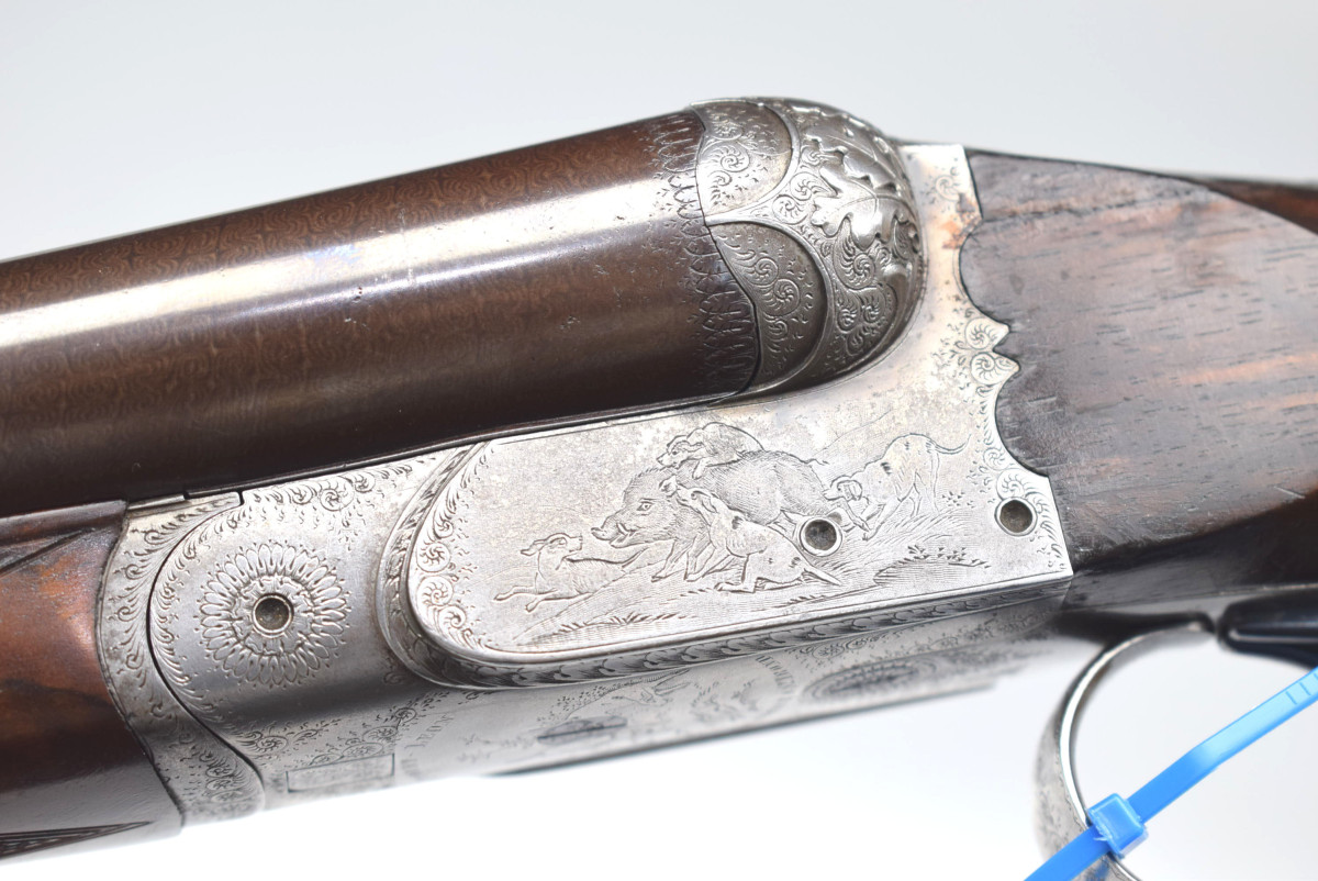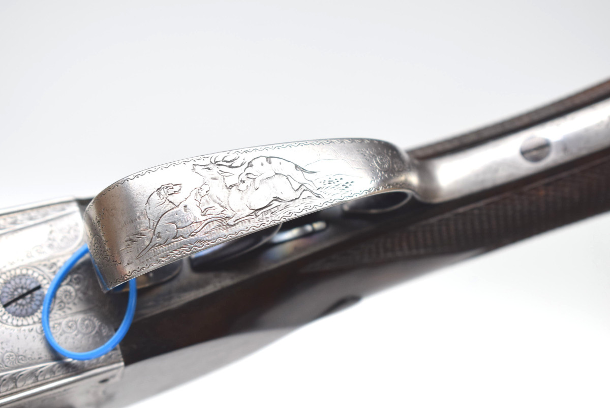 wunderschön hochglänzend bräuniertes Laufbündel, reich gravierte Basküle mit jagdlichen Motive