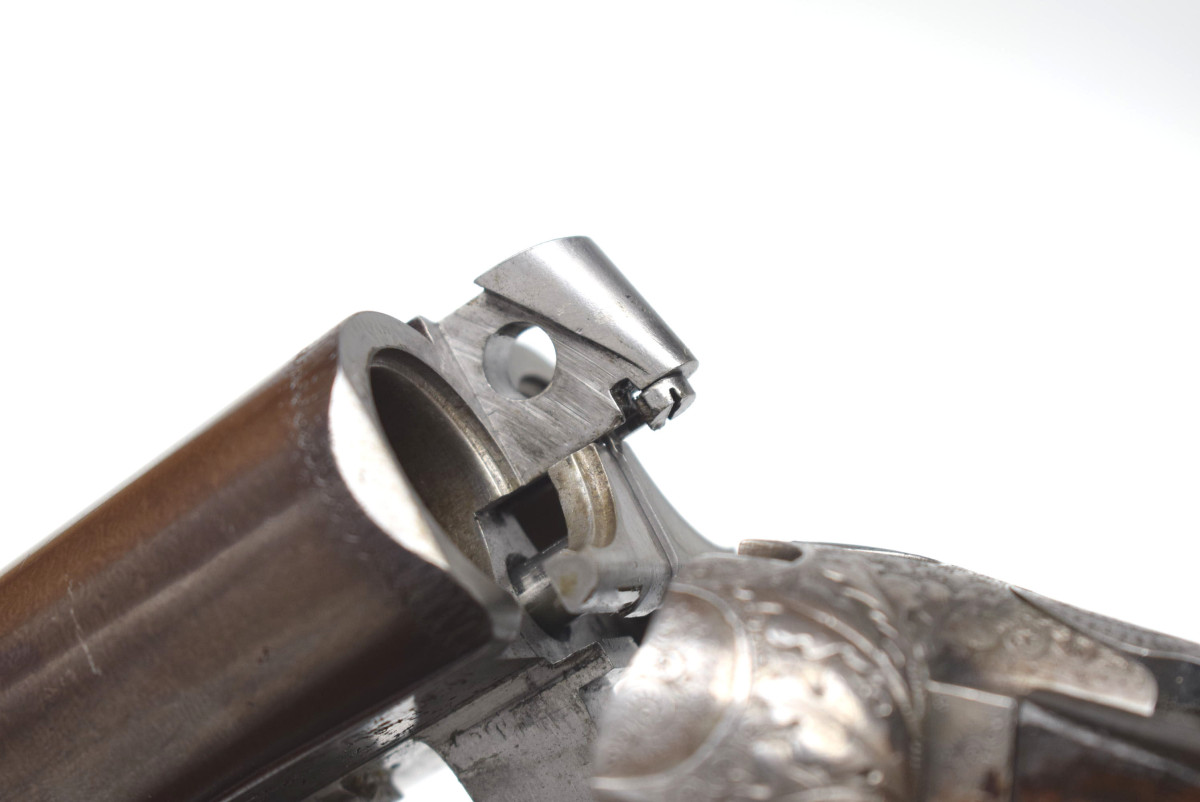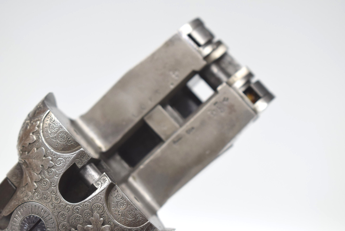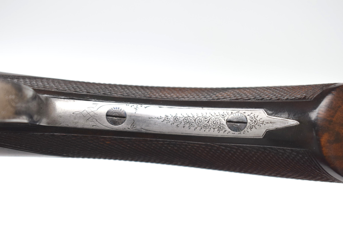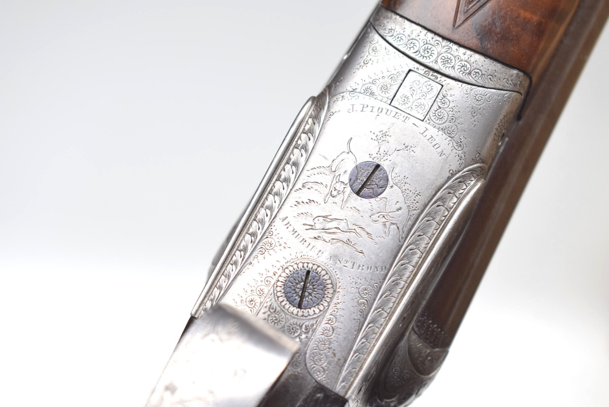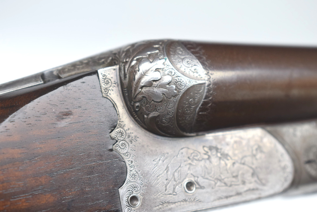 wunderschön hochglänzend bräuniertes Laufbündel, reich gravierte Basküle mit jagdlichen Motive