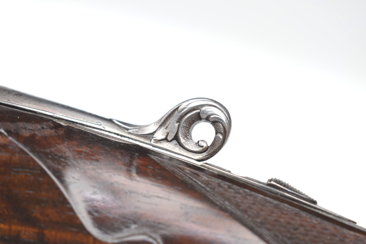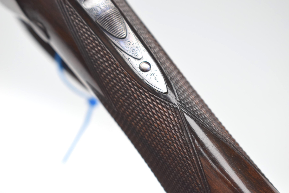 fein gemaßerter Wurzelholsschaft, feine griffige Fischhaut, seidenmattes Ölfinish, tief gearbeitete Tränen, intensiv gebläute Elemente und Schrauben