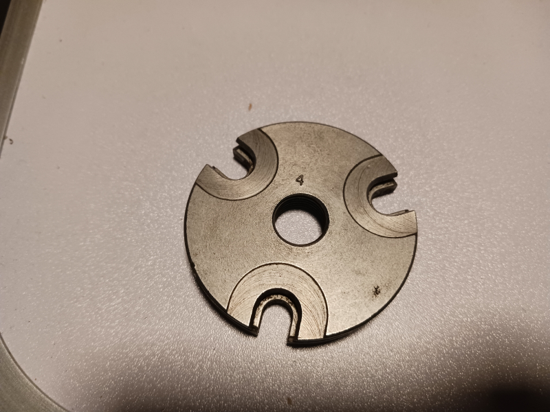 Hülsenhalterplatte Nr. 4 für die Mehrstationenpresse Lee Pro 1000. Die Platte Nr. 4 passt für .222, .223 und 9 mm kurz. In meinen anderen Auktionen finden Sie Hülsenhalterplatten Nr. 11 (für .44 mag., .44 spezial und .45 Long Colt) sowie Nr. 19 (für 9 mm, 10 mm Auto und .40 S&W).
