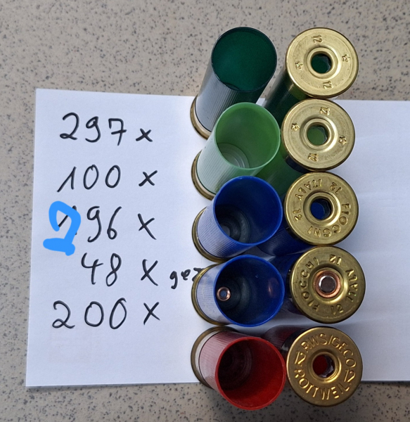 Verkaufe wegen Bestandsreduzierung verschiedene Schrothülsen und 239 Stück Fiocchi 616 Zündhütchen (letzten 2 Bilder). Die 100 grünen und 296 plus 48 gezünderten blauen Hülsen sind 12/70 von Fiocchi. Die 200 roten sind von RWS in 12/67 . 48 Stück der blauen Fiocchi sind gezündert und bedruckt. Es sind 941 Stück (Habe noch 100 von den blauen gefunden) unbenutzt. Dazu gebe ich noch eine Tüte mit abgeschossenen Hülsen. Und eine Tüte mit abgeschossenen Winchester AA Hülsen gezündert plus lose Zündhütchen.