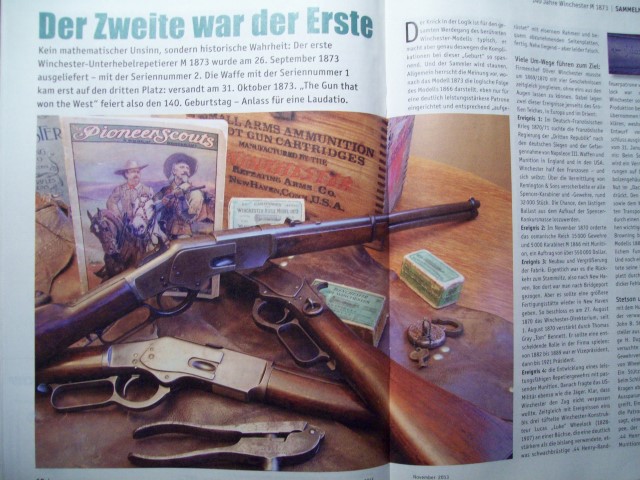 Für Waffenfreunde und Gewehrschützen +++ angeboten wird ein Visier - Heft mit einem sehr interessanten Bericht ++ ** 140 Jahre Unterhebelrepetierer Winchester M 1873 ** -- Ein faszinierender Name aus der Waffengeschichte für Unterhebelrepetierbüchsen - " Winchester ". ++ Der Zweite war der Erste -- Pünktlich zum 140.Geburtstag der Winchester " 73 " gibt es brandneue Informationen für Sammler der " gun that won the west "" -- Interesse geweckt ? --- Weitere Einzelheiten können Sie in dem Bericht (10 Seiten) nachlesen. +++ und es gibt noch weitere interessante Berichte - z.B. für Revolver -Schützen ein Bericht (6 Seiten) - ** Verjüngungskur- Colt Trooper MK III in .22 l.r und .357 Magnum ** mit techn. Daten und Ergebnisse vom Schießtest. -- oder ein Bericht für Blankwaffen-Sammler - ** Neuer Puma Hirschfänger** +++ Das Heft ist gebraucht , befindet sich aber in einem sehr guten Zustand +++ Der Versand erfolgt als Großbrief mit DHL (unversichert) ; die Versandkosten gelten nur für Deutschland.+++ Bieter aus dem Ausland bitte Versandkosten vor Gebot erfragen. +++ Versandrabatt möglich, sehen Sie auch meine anderen Angebote. +++ Privatverkauf, daher keine Gewährleistung, Garantie oder Rücknahme. 3111 +++ Fragen bitte mailen.