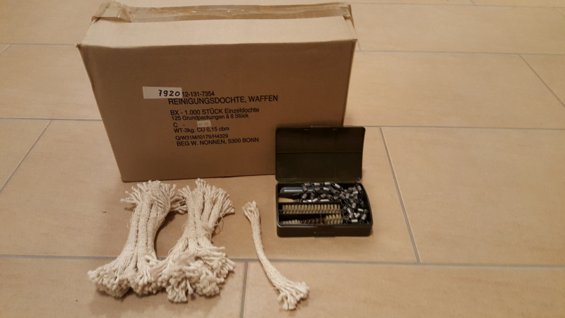 1000 Stück Original Bundeswehr Reinigungsdochte für Kal. 9 - Kal. 5,56mm 125 Packungen à 8 Stück, besteht aus jeweils 16 Baumwollfäden.