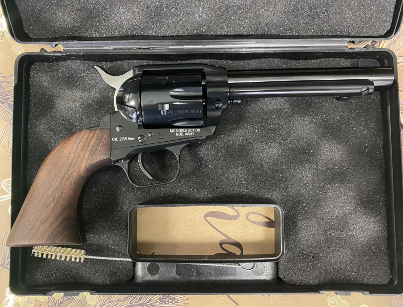 Verkaufe eine ME Single Action Army LEP im Kaliber 5,5mm Diábolo. Die Waffe ist in einem sehr gutem Zustand und funktioniert einwandfrei. Ich besitze den Revolver seid ein paar Jahren, aber da er nur rumliegt verkaufe ich ihn.