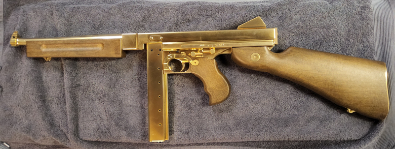 Das M1A1 Legendary im Gold -Look ist vielen bekannt aus Film-Klassikern der 20er Jahre und auch als Tommy Gun oder Thompson Gun. Es kommt in Vollmetall. Schaft und Pistolengriff bestehen aus hochwertigem Kunststoff in Holzoptik. Der Pistolengriff ist ergonomisch geformt mit Fingermulden. Die Schaftkappe ist aus Metall gefertigt. Die BlowBack Funktion sorgt für ein realistischeres Schießgefühl. Weitere Merkmale sind ein Single Action Abzug und eine Schwenksicherung. Am Modell befinden sich Ösen zur Befestigung eines Tragegurtes. Es wird mit Stahl BB's im Kaliber 4,5 mm betrieben. Der Antrieb erfolgt durch 2 Standard 12 g Co2-Kapseln. Das Magazin hat eine Kapazität von 30 Schuss.