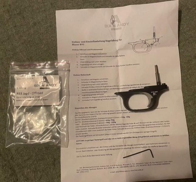 Er passt in die Blaser R93 mit Kunststoffschaft, konkret in die "Offroad" und "Professional" Modelle. Er ist leicht und schnell einzubauen. Ein entsprechendes Infoblatt ist dabei.