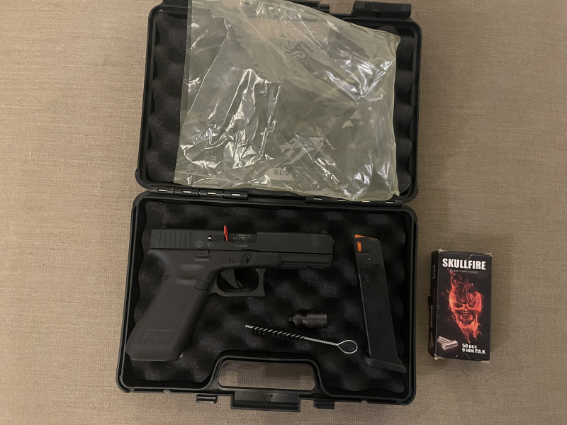 Glock 17 P.A.K Schreckschuss 9mm Neu und ungeschossen. Mit Koffer, Bedienungsanleitung, Bürste und Abschussbescher. Bei Bedarf 50er Packung 9mm P.A.K Patronen. Abgabe nur an Personen ab 18 Jahren.