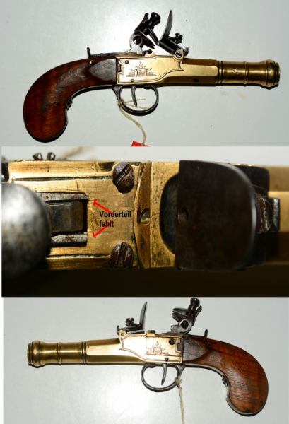 Steinschloss-Terzerol um 1820, Messingkasten und -lauf, Lauflänge 85mm, Gesamtlänge20 cm, Kaliber 11mm, keine Markierungen aber wahrscheinlich englisch, am Sicherungsschieber fehlt vorne das Teil, das den Pfannendeckel blockiert, technisch in Ordnung und funktionsbereit