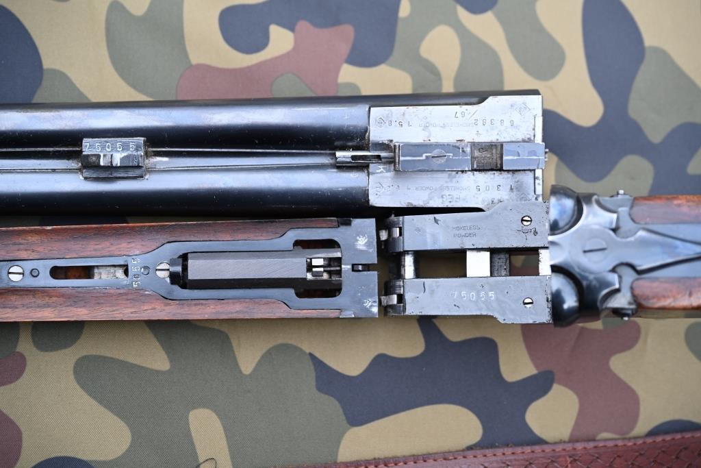Brünierte Basküle mit verstärkten Muscheln und Ladezustandsstiften, doppelte Laufhakenverriegelung, Doppelabzug, automatische, Schiebesicherung auf dem Kolbenhals, kräftiger Ejektor, Demi-Bloc-Läufe