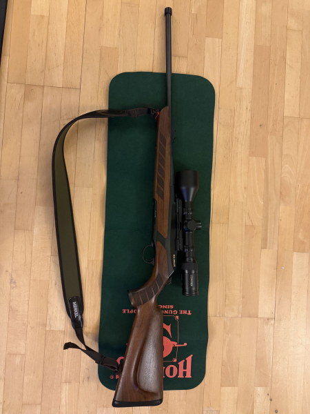Am Lauf wurde ein Mündungsgewinde inzugefügt. Es ist ein Schnellverschluss für einen A Tec Schalldämpfer aufgeschraubt. Ein 3 Schuss Magazin gehört dazu. Das Glas und die Montage sind nicht Bestandteil der Auktion, können aber bei Interesse miterworben werden.