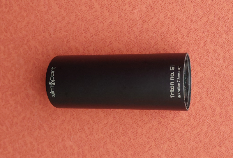 Ein Schalldämpfer - Vorderteil von Hertseller "aimSport", Modell: Triton 5i / passend bis Kaliber 7,7mm (.30) / wenig geschossen, mit oberflächigen Schauchspuren im Inneren /