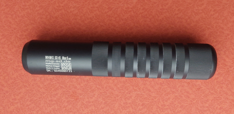 Ein Overbarrel- Schalldämpfer von Hersteller "WHMG", Mod. SD45 / passend bis Kal. 6mm / wurde wenig genutzt, mit oberflächigen Schmauchspuren im Dämpfer / Außendurchmesser 45mm, Gesamtlänge mit allen Kammern ist 23,5cm / mit 6 abnehmbaren Einzelkammern (je 1,5cm) / Gewinde ist 13x1mm /