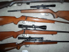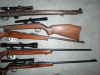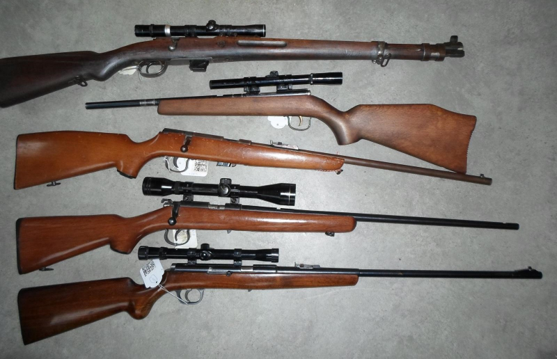 4 Kleinkalibergewehre Kaliber .22 l.r. und eine Repetierbüchse Kaliber .22 Winchester Magnum. Die Waffen sind alle funktionsfähig, werden aber aufgrund des Alters als defekt verkauft.