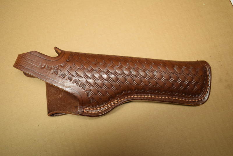 🔸 Western‑Revolverholster mit Korbflecht‑Punzierung Ei Holster aus braunem, geprägten Leder in Korbflecht-Optik